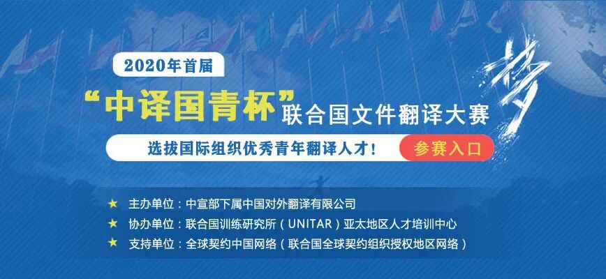 在此背景下,中国对外翻译有限公司联合多家联合国机构及国际组织,将于2020 年4月2日至5月6日举办首届“中译国际组织青年人才杯”(简称“中译国青杯”)联合国文件翻译大赛。