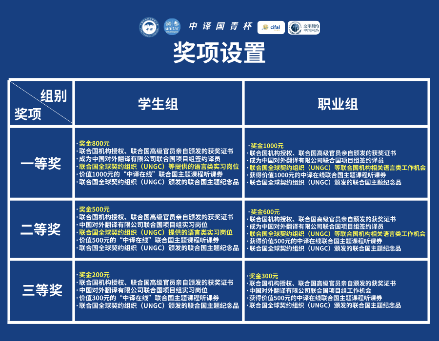 本届“中译国青杯”每个比赛项目设一等奖、二等奖、三等奖若干名。另设优秀组织奖(单位)若干名。