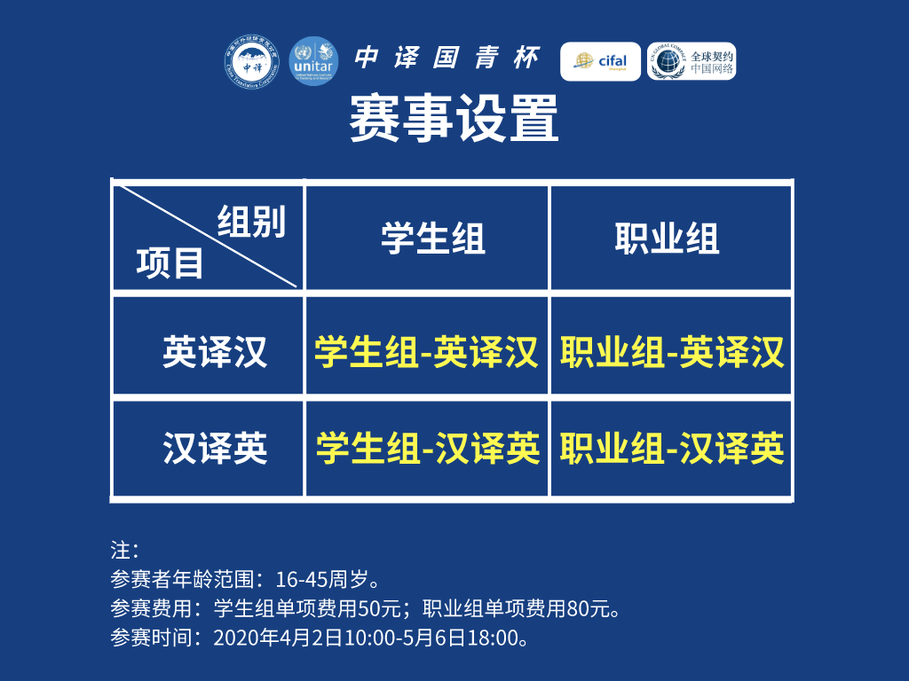 “中译国青杯”联合国文件翻译大赛将于4月2日-5月6日在线上举行,获取大赛后续详情及最新资讯,请继续关注“中译在线”官方网站、官方公众号等信息渠道。
